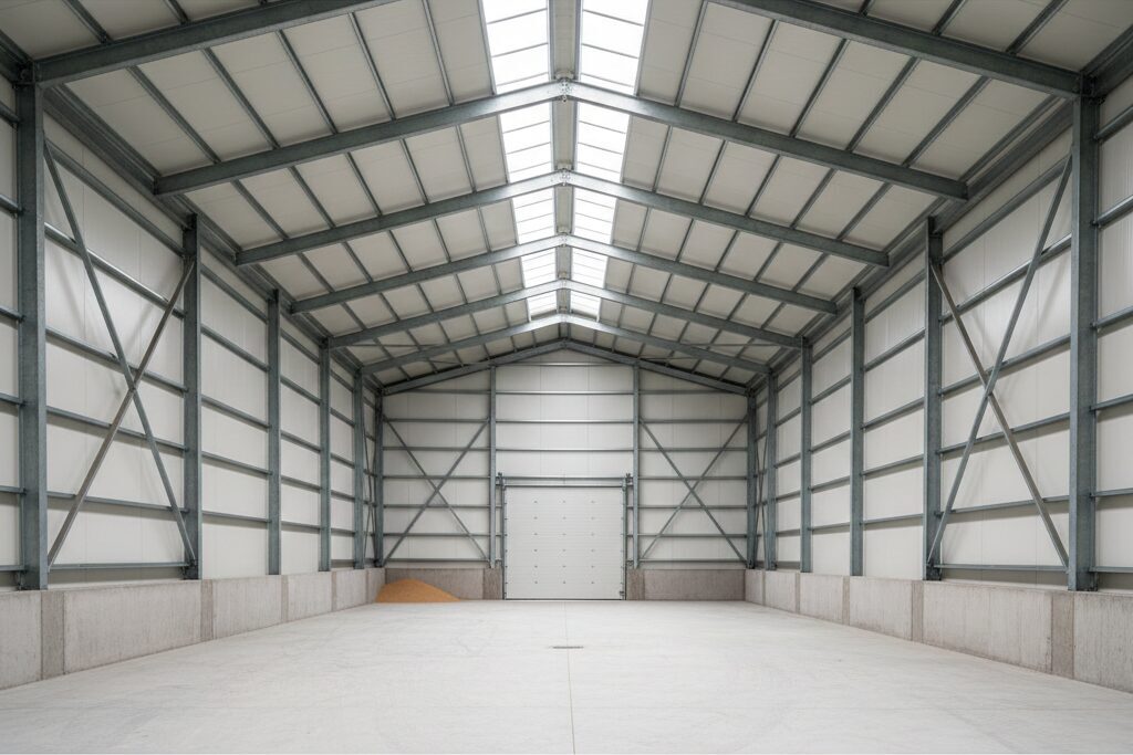- • Pastiprinātas sienas: Konstrukcijas rēķinātas tā, lai izturētu graudu sānspiedienu, bērot tos tieši pie sienām.